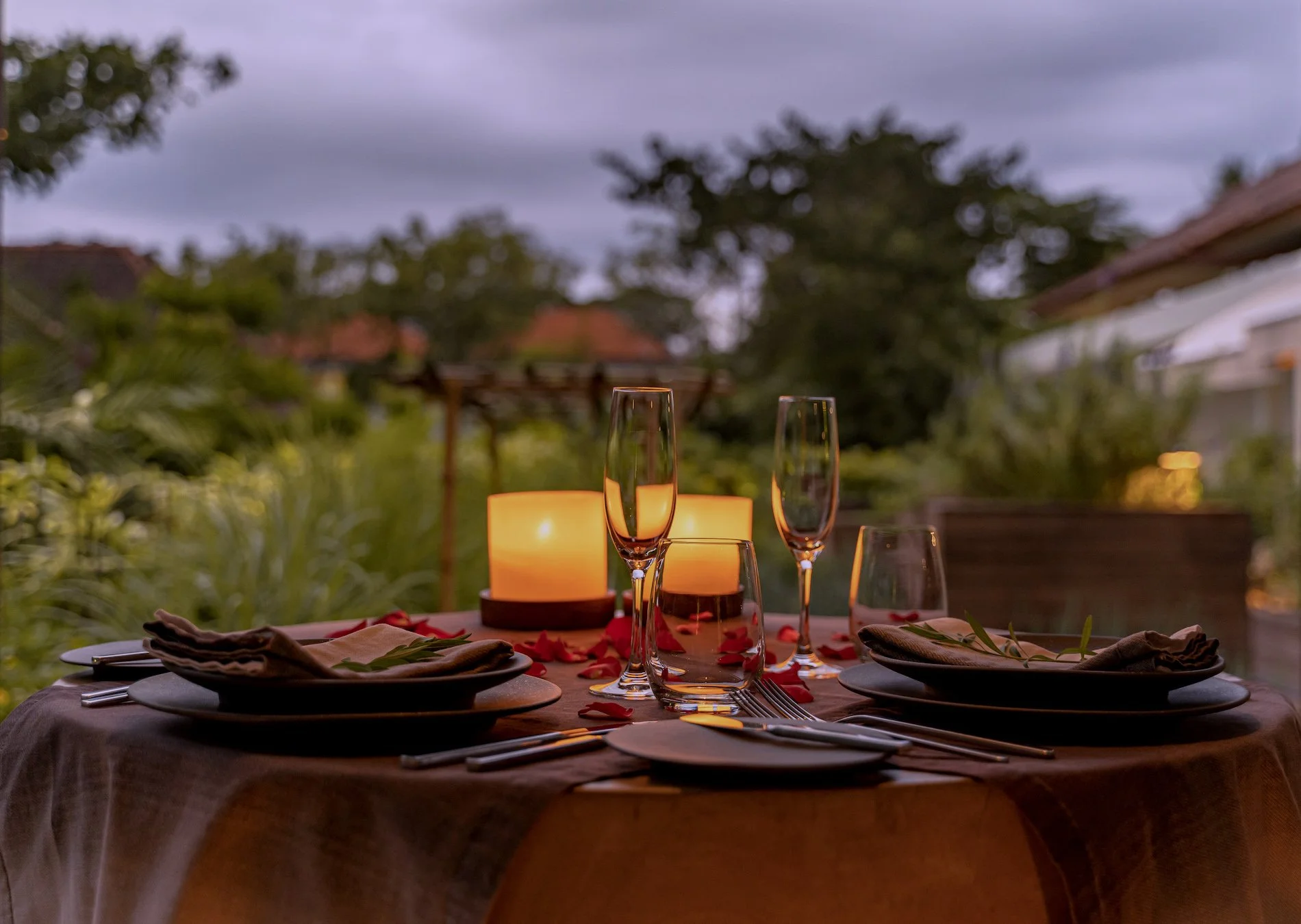 Couples can elevate their evening even further with Embers’ romantic 4-course dinner—an experience designed around rustic Mediterranean flavors, Bali-grown produce, and seasonal ingredients. Candlelit tables and curated courses set the perfect stage for celebrating love in Ubud.